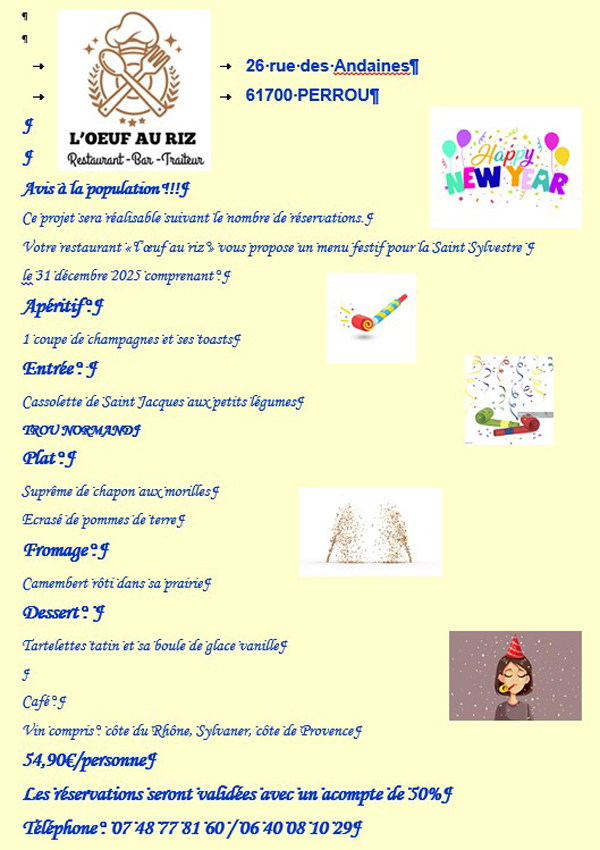 Repas de la Saint Sylvestre le 31 décembre 2025 à “L’œuf au riz” à Perrou